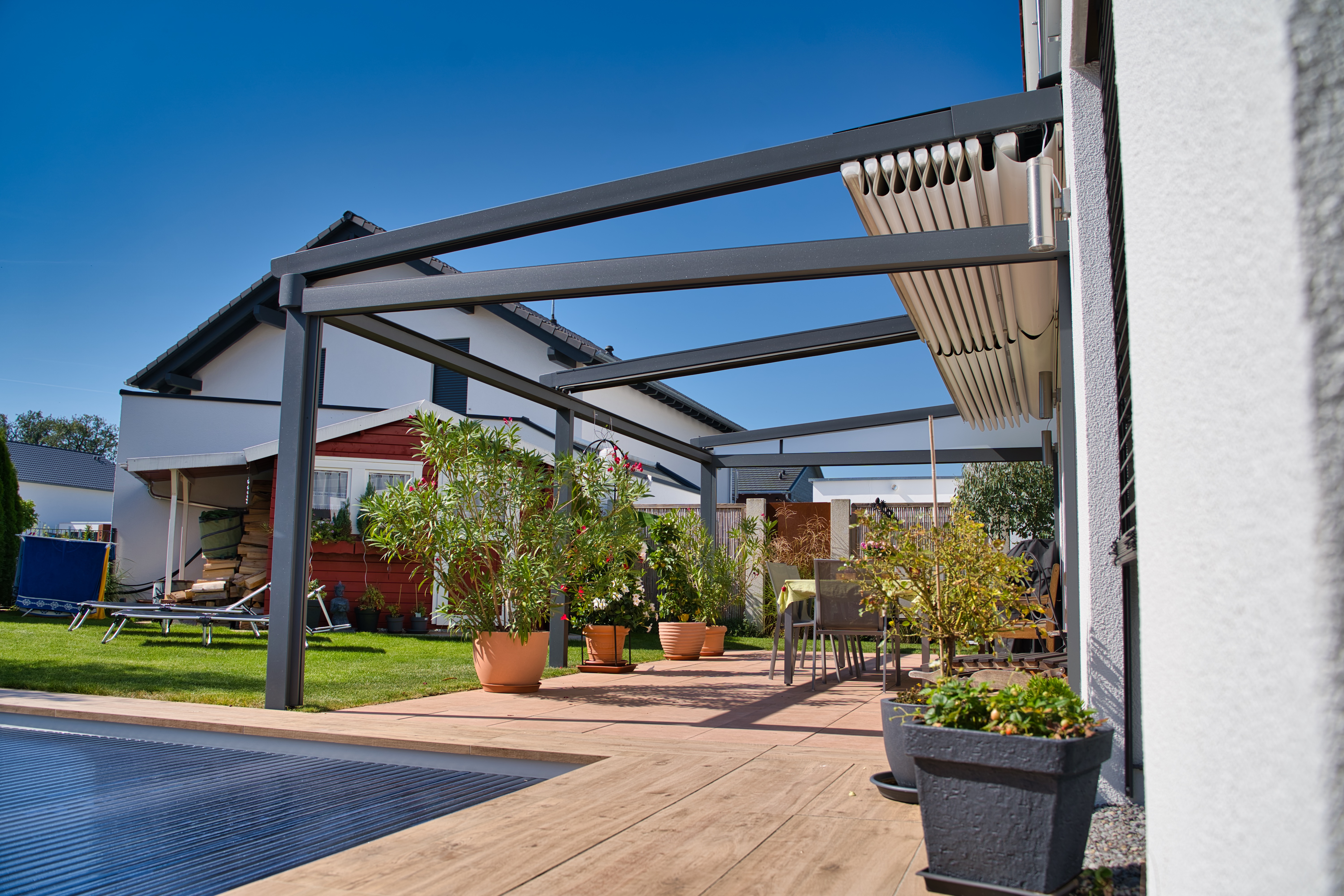 Die perfekte Kombination aus fester Konstruktion und flexibler Markise. Ideal für große Flächen und anspruchsvolle Wetterbedingungen mit Windstabilität bis 120 km/h.